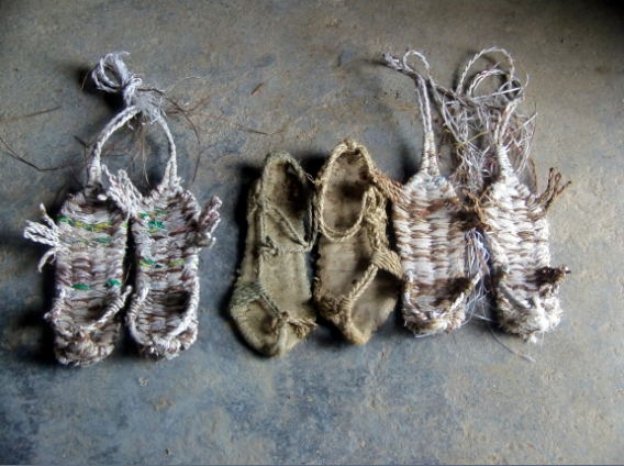 其制作過程如下:選取當?shù)爻赡贶诼椋蔚敉馄ぃ栏蓚溆茫ㄒ灿杏米亟z、龍須草、構(gòu)樹皮、稻草、舊布條);搓好繩子,掛到草鞋耙子上編織;編織成鞋的樣子,再上好鞋耳子,穿好左右兩只即可穿用。