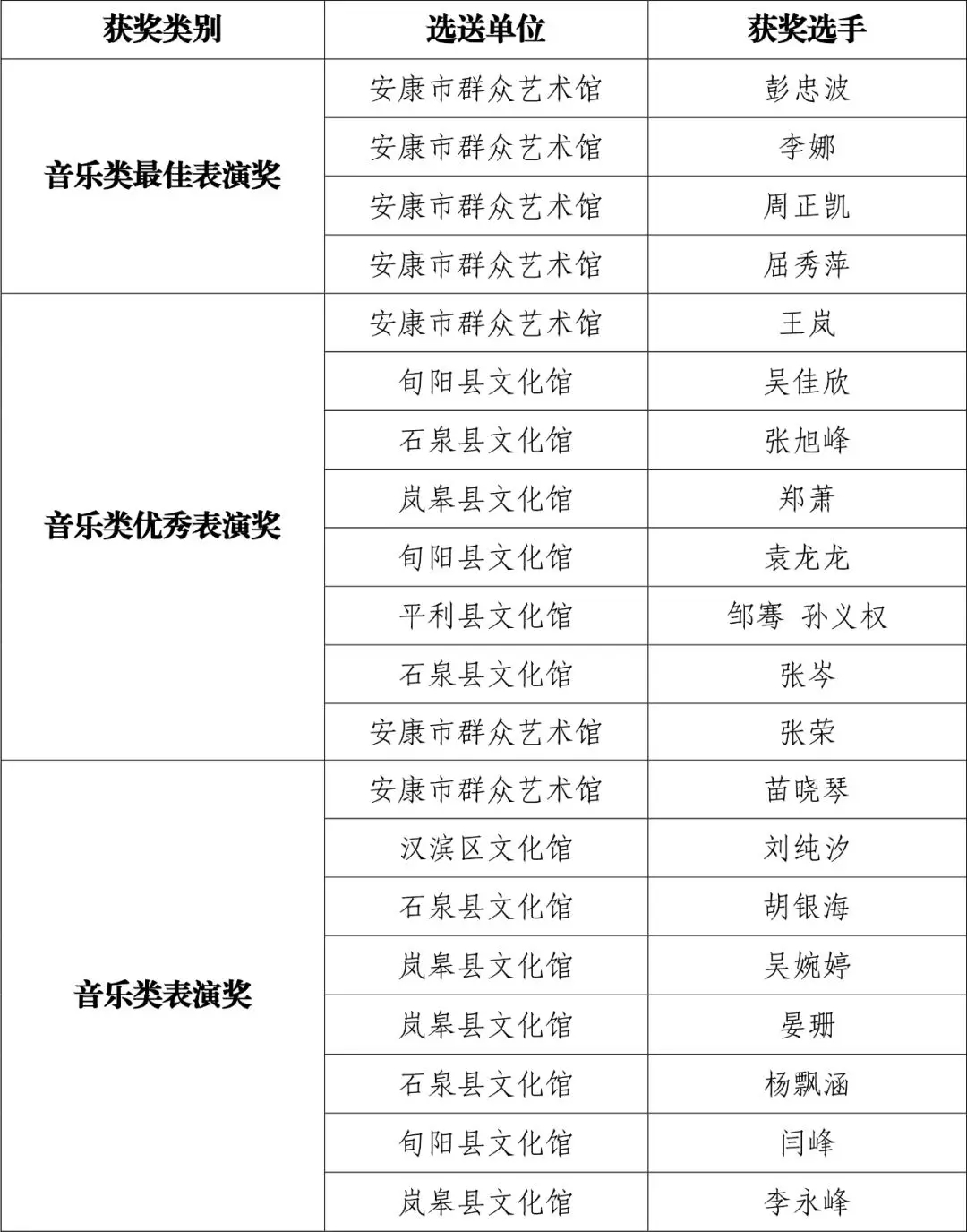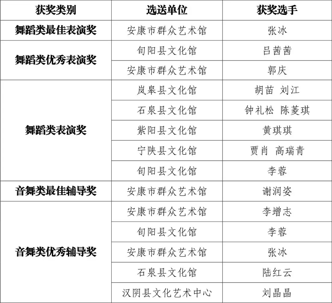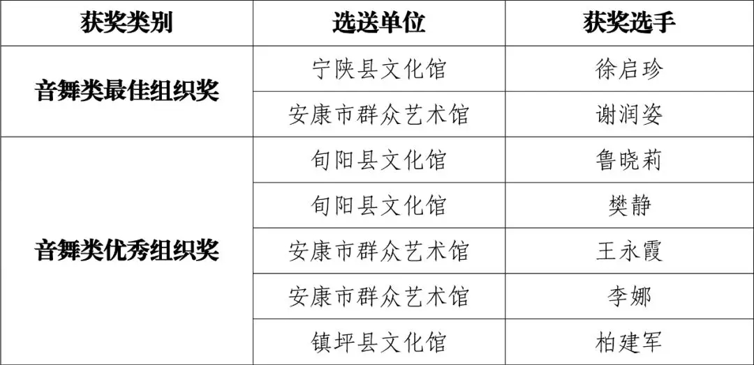 現(xiàn)將群星風(fēng)采·第六屆陜西省群文系統(tǒng)業(yè)務(wù)干部技能大賽安康選拔賽(音舞類)比賽結(jié)果公布如下: